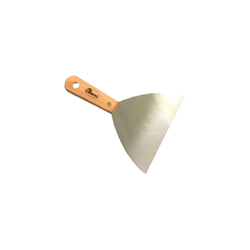 Possui lâmina em aço inoxidável, resistente à corrosão e flexível, ideal para aplicação de massas, raspagem de tintas e limpeza de superfícies. O cabo em madeira proporciona empunhadura firme, confortável e segura durante o uso.