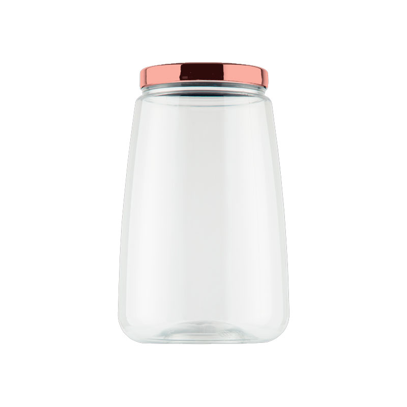 Material: Plástico resistente, corpo transparente e tampa com acabamento “rose” metalizado