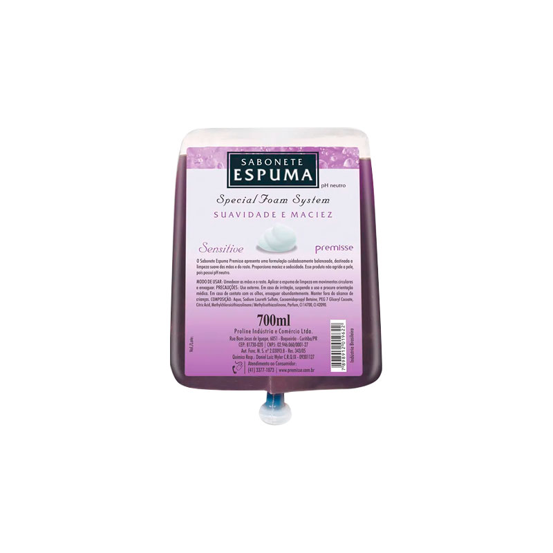 Sabonete líquido em espuma da marca Premisse, refil de 700 mL, indicado para limpeza suave de mãos e rosto. Não é detergente nem sabão de uso doméstico — é um produto de higiene pessoal.