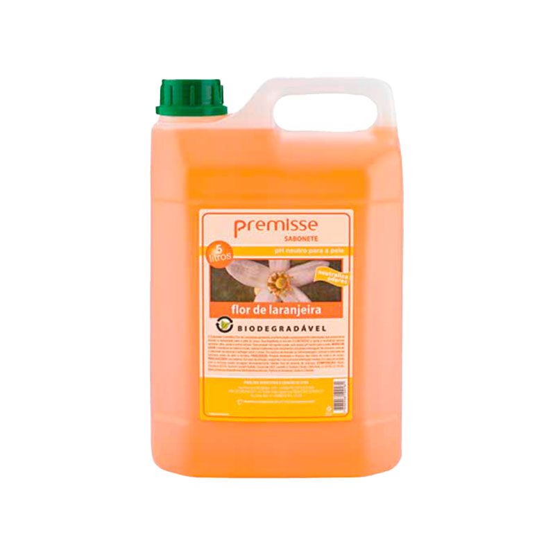 Sabonete líquido da linha Flor de Laranjeira, em galão de 5 litros. Indicado para a higienização de mãos, rosto e corpo, ideal para uso doméstico ou em locais com maior consumo, como lavabos, empresas, academias e clínicas.